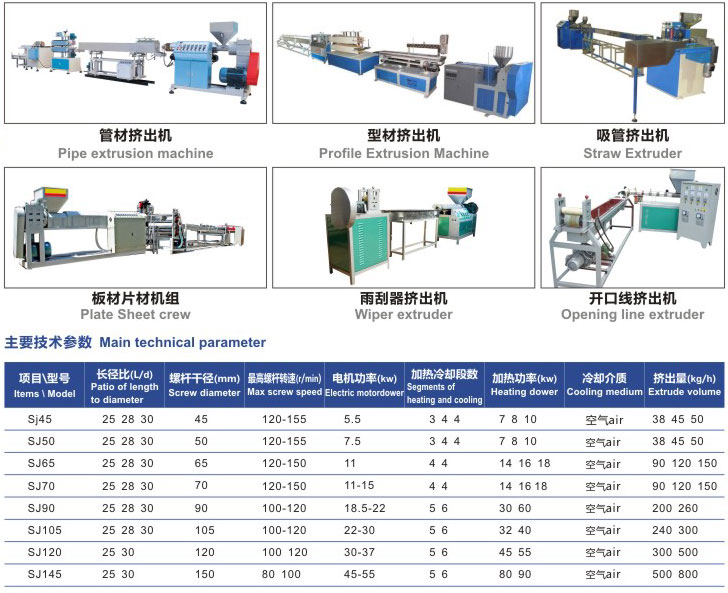 SJ系列單螺桿塑料擠出機(jī)配置各種結(jié)構(gòu)形式螺桿,可適用于加工PVC,PE,PPR,PEX等材料,具有轉(zhuǎn)速高,塑化均勻,產(chǎn)量高的特性,設(shè)有排氣,水冷裝置,無(wú)級(jí)調(diào)速和溫度自控等裝置,體積小,外形美觀,裝置不同的機(jī)頭和輔機(jī),適用于熱塑性塑料的薄膜,軟(硬)管材,棒材,板,異形材等制品的生產(chǎn)。